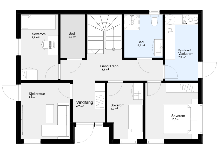 Bud er en familievennlig bolig med fire soverom og god plass til både hverdagsliv og overnattingsgjester. I tillegg til den åpne stue- og kjøkkenløsningen, får du en kjellerstue som gir ekstra fleksibilitet – perfekt for barna, ungdommen eller som hjemmekino.