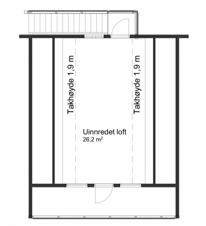 En trapp fører deg opp i andre etasje hvor du finner et rom på nesten 50m2 med utgang til veranda. Dette er et rom som kan benyttes til en ekstra stue, et stort hobbyrom eller for ekstra lagringsplass.